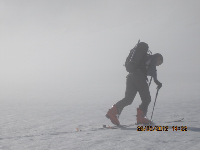Decidimos no subir a la cima por el collado de la Contende si no que, después de acordarlo, nos adentramos en una pala de nieve situada al noreste del Gabedaille que conduce directamente hacia la cresta cimera. La nieve es pesada, se ha transformado mucho con el calor y no nos da «buen rollo»……..lo comento con Nacho, él está de acuerdo, pero matiza que caso de caer algún alud será por fusión y no de placa. Tiene razón…. y pienso en lo extraño de este invierno lleno de contrastes…….seguimos subiendo….la niebla nos envuelve…..ahora hace frío…..