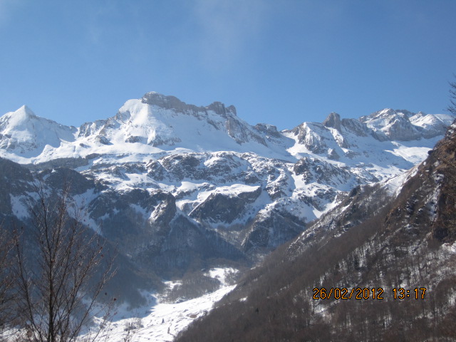 Cuando llego al collado me vuelvo hacia el valle y me quedo fascinado con el espectacular paisaje que veo a mis espaldas….¡¡¡por fin ha quedado atrás el bosque!!!….el horizonte se amplia….veo en plenitud el valle de Cotende con la cabaña de Atsout (creo que se llama así)……hace más calor y por ello la nieve se transforma…..avanzar se hace pesado……nos volvemos a reunir. Escucho como  Pilar comenta algo con Nacho acerca de los colores del paisaje. Me parece algo normal en ella, al fin y al cabo es una insaciable creadora de color, textura y formas que se tranforman en bellos paisajes cuando frente a un liezo juega con «carboncillos» «oleos» y «barnices»……me quedo con el comentario….¿será el color?