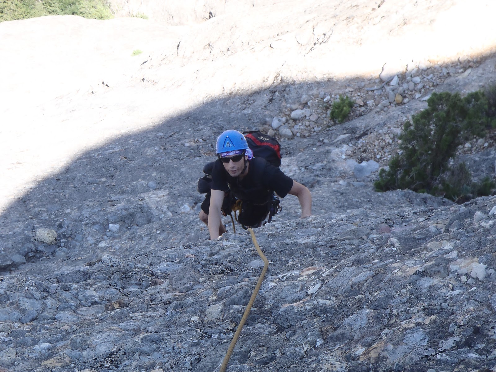 Comenzamos la escalada con unas trepadas de III hasta encontrar una reunión que marcara el comienzo de las «dificultades». Desde este punto la cosa se pone un poco mas vertical y comenzamos a escalar largos de IV muy bien asegurados con parabolts y con una roca muy buena durante todo el recorrido. Los largos se suceden con la misma tónica y poco a poco vamos ganando altura. En dos horas estamos en la cima de la Gronsa Central, con unas vistas impresionantes de los Ports.