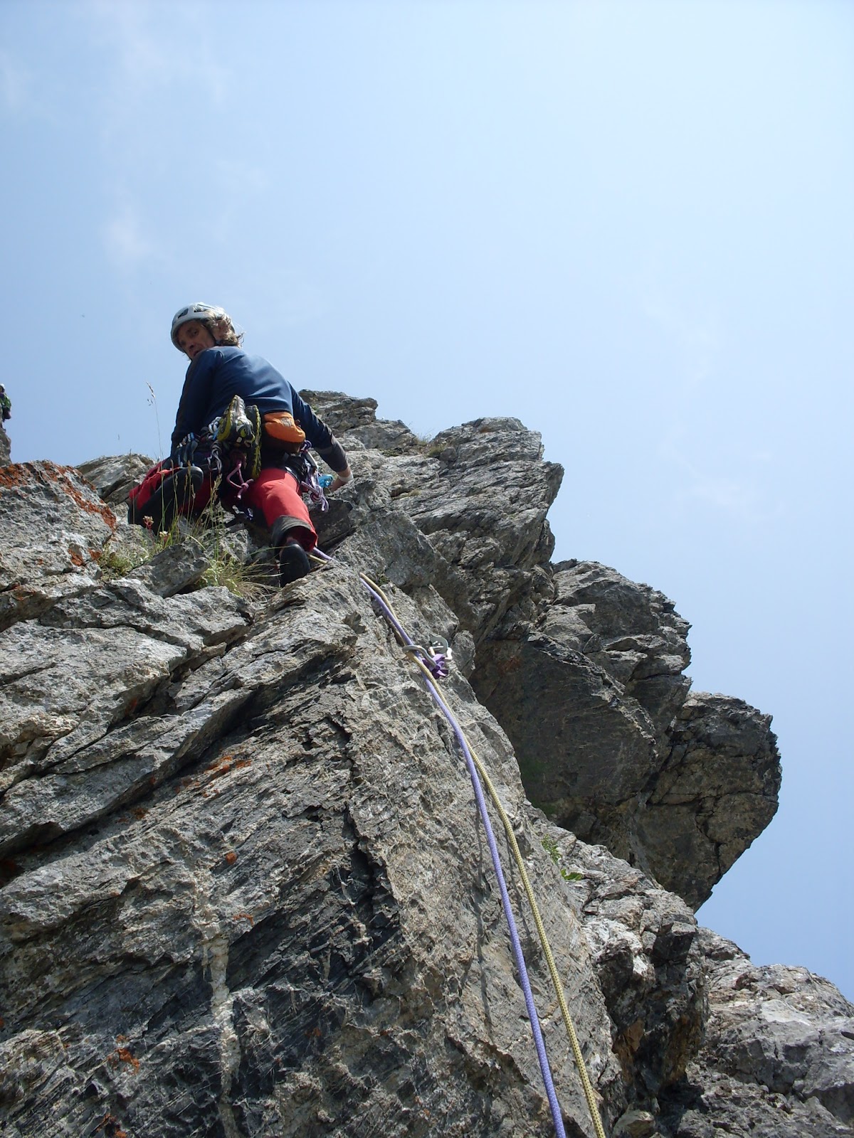 El diedro aparece bastante roto, con roca que a la vista no es muy buena pero que Oscar va radiografiando perfectamente y llega a la cuarta reunión sin tirar ni una sola piedra. Ya solo nos queda la arista de salida hacia las campas, una arista de tercero con muy pocos seguros y precarios pero bastante aérea. Cuando llego al final de la arista no encuentro nada donde asegurar a Oscar y me decido a asegurar a hombro sentado en el suelo contra unas rocas. No hay problema, al poco veo aparecer la sonriente cara de un buen escalador con la satisfacción de haber concluido una ruta muy guapa con carácter alpino y en un lugar idílico como es el Portalet.