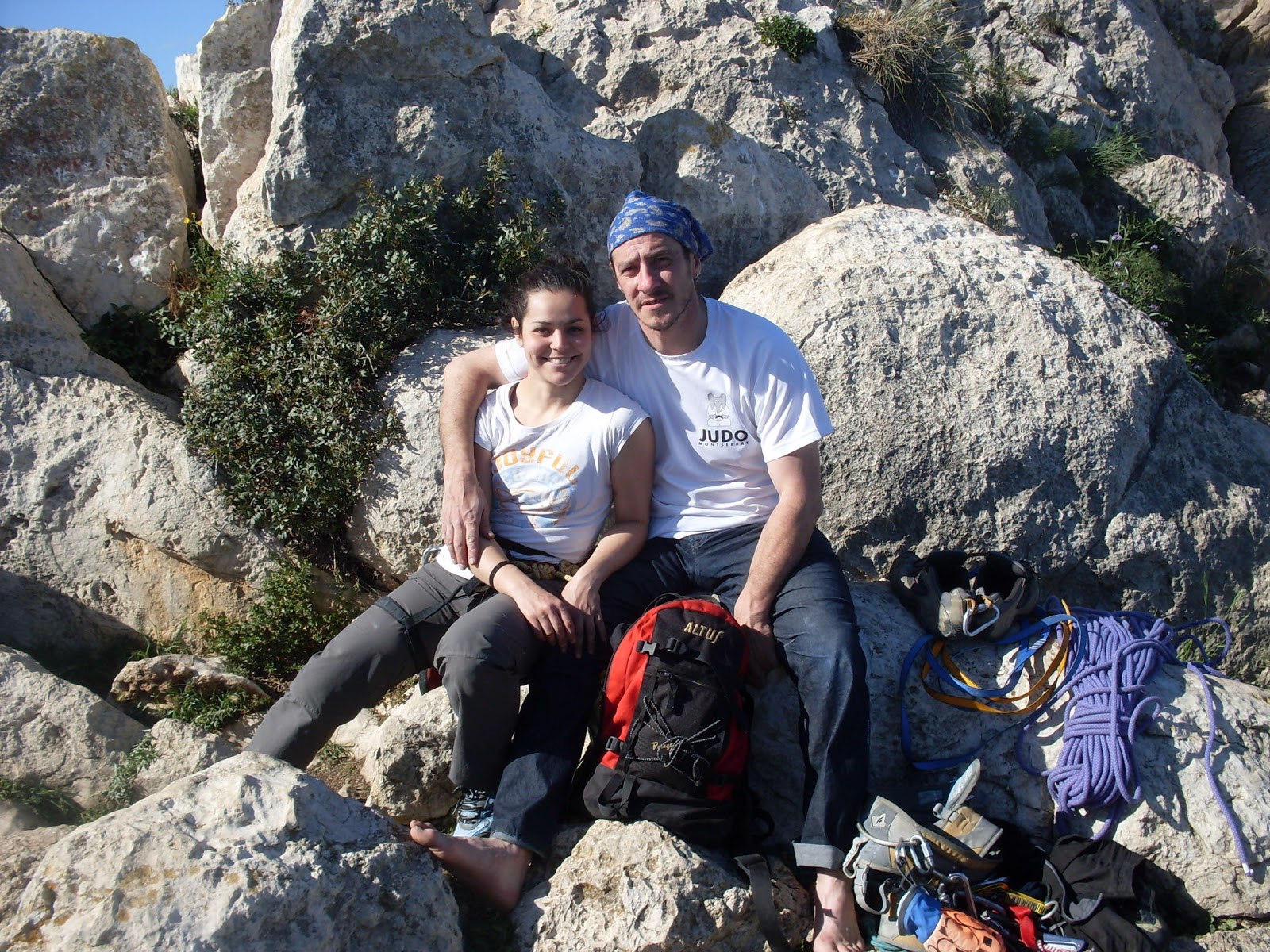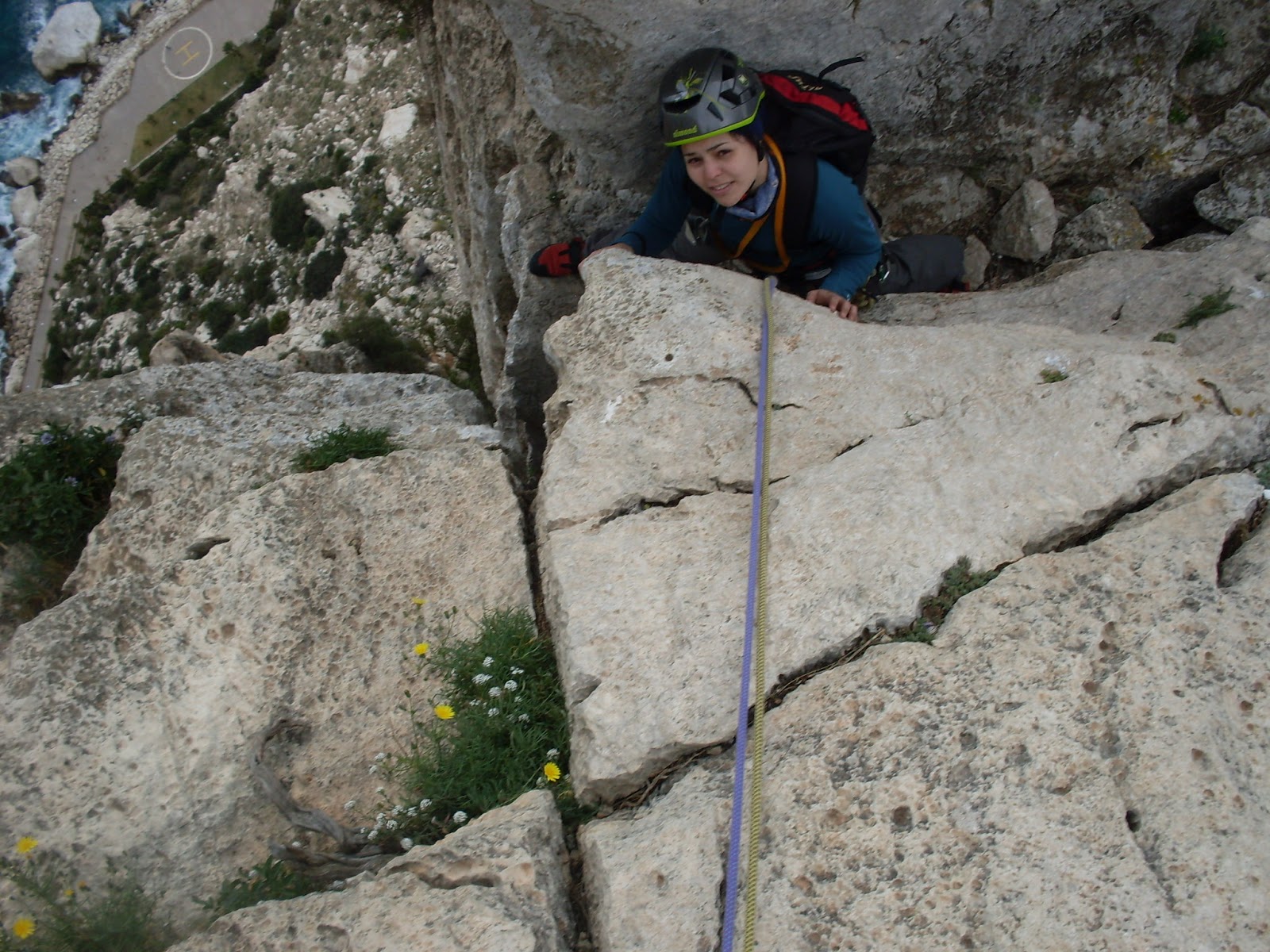 Para no molestar a los señores Gaviotez y ponerlos nerviosos, me decido a entrar un poco mas a la izquierda del comienzo de la vía ya que ayer, unos escaladores nos dijeron que había un nido de gaviota y que había que pasar casi por encima de el para acceder al primer largo. Me meto en harina y subo hasta la vira desde la que dan comienzo otras vías paralelas a la que nosotros vamos a subir. No encuentro la reunión a la primera y me voy yendo a la derecha hasta un parabolt en el que decido montar la reunión y recuperar a Ángela. La reunión de la vía esta todavía un poco masa la derecha, a unos tres metros con dos parabolts, pero desde donde estaba no la podía ver a causa de unos bloques.