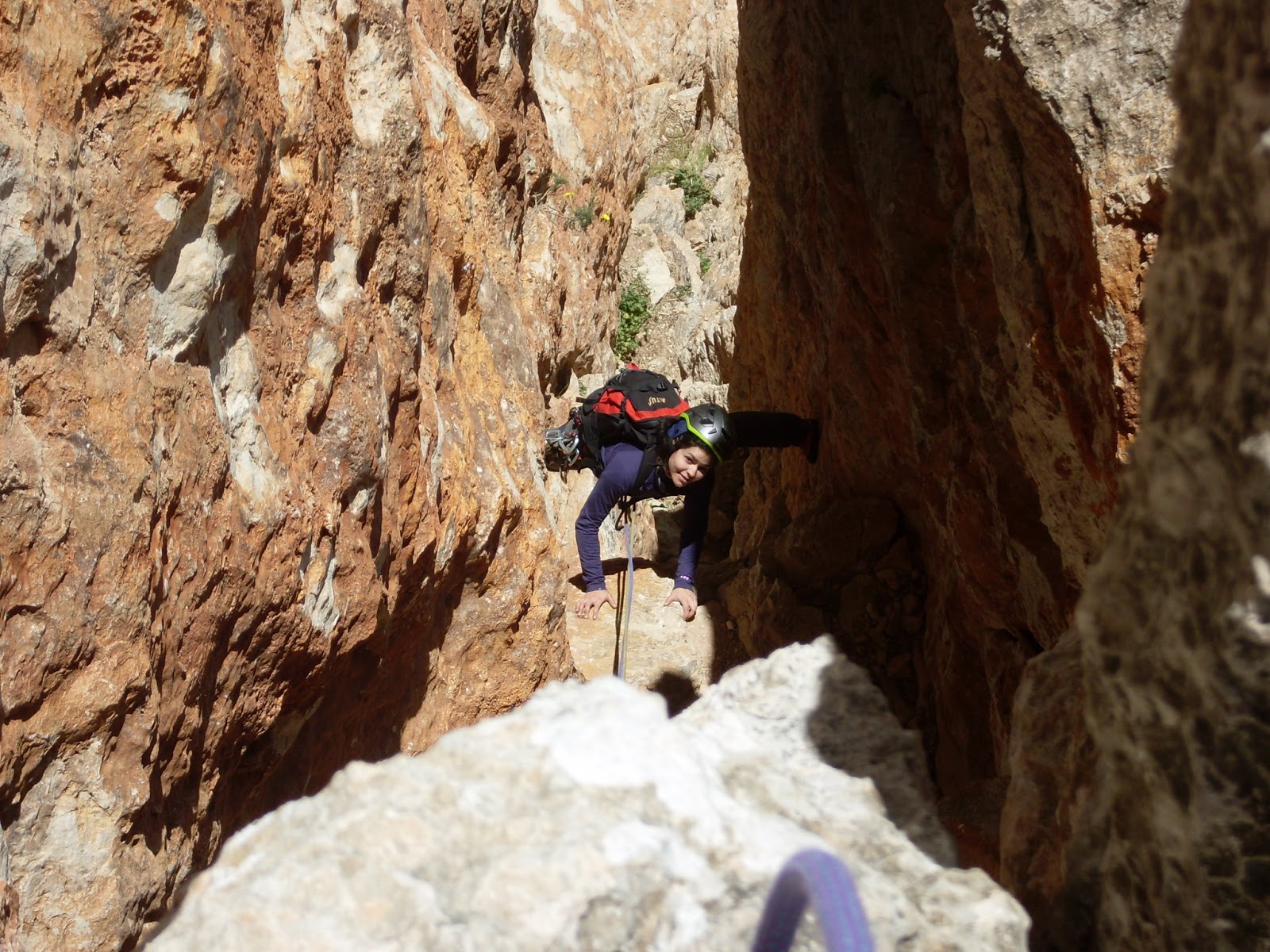 Largo 8.- IV+ – V Otro bonito diedro, protegido por dos parabolts (el primero muy alto) y que termina en una chimenea angosta. Esta salida del diedro se puede fuera de la fisura o por dentro. Yo, como no lo vi muy claro, me metí en la fisura-chimenea (Off-width) y me arrastre literalmente por dentro. Una vez dentro no puse ningún seguro, ya que de lo encajonado que estaba era prácticamente imposible salirse de allí.