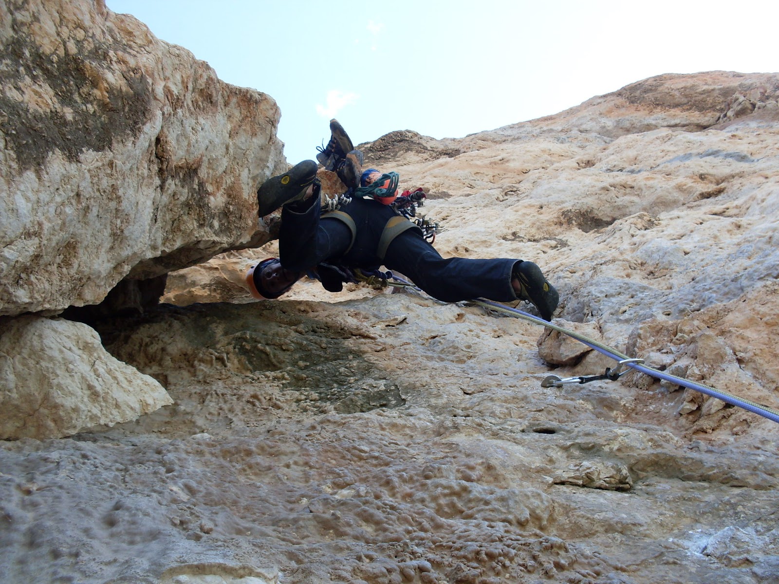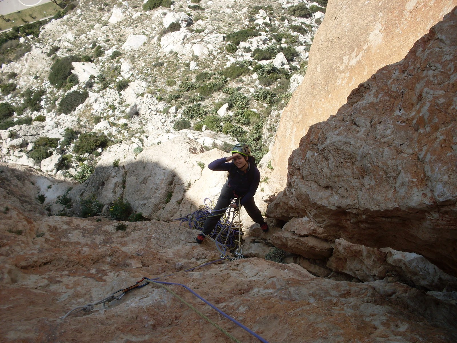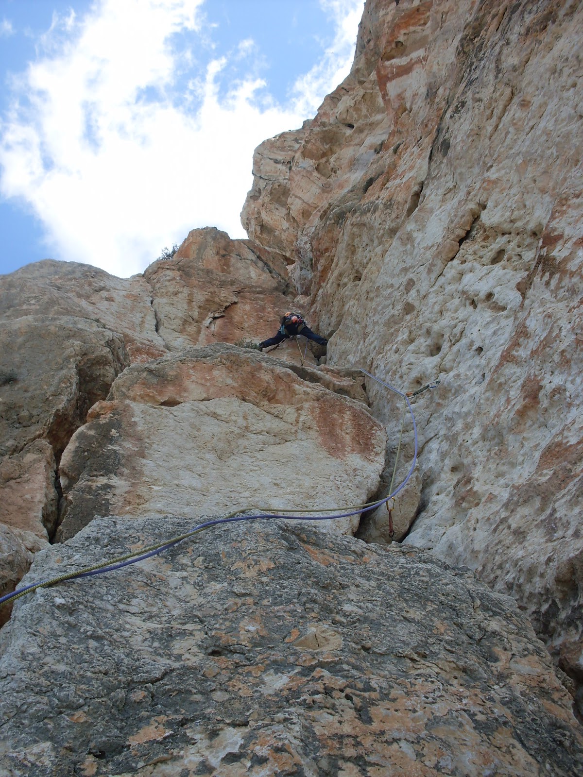Largo 2.- V+ Comienzo a escalar por la fisura y con muy buenos agarres voy ganado altura hasta llegar a la 2ª reunión de la vía, muy cómoda en el interior de una pequeña cueva. En uno de los pasos claves, saque los fisureros del arnés y cuando elegí el que entraba perfectamente en la fisura, sin saber cómo ni por qué, mi mosquetón con casi todos los fisus se dio el vuelo de su vida y acabo 50 o 60 metros más abajo, entre los matorrales. Un escalador que pasaba por allí (iban a “Los Valencianos”) los recogió y quedamos en la cima para recuperarlos, pero ellos debieron de ir más rápido y cuando nosotros llegamos, ya no estaban allí. Pregunte en el parking por los fisus o por el escalador que los recogió, pero nunca más se supo. En este largo encontraremos algún parabolt en los pasos más chunguillos, aunque para el resto será aconsejable subir algún friend o empotrador (y que no se te caigan). Un largo exigente y muy bonito.