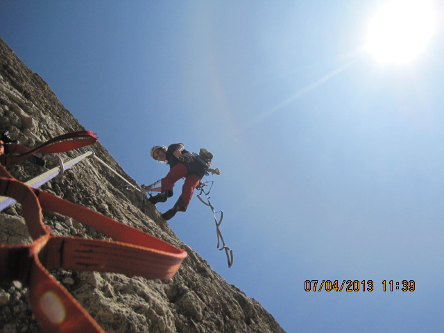 Dos pasos en A1 me sitúan a la altura del tercer «spit» del que me cuelgo para resoplar un poco, vaya calentón de entrada -grito-, ¿como? -pregunta Chabi- no nada, nada, ya verás cuanto te toque. A partir de aquí comienza un muro de unos 35 metros con equipamiento muy viejo (buriles, clavos, cordinos y algún spit). Me planteo forzar en libre (6b+) algunos pasos pero desisto, no se «chapa» bien y paso de complicaciones, evidentemente sólo hago en libre los tramos obligados, un total de tres. Dentro de un gran nicho hay tres «spits» que sirven para la reunión. Montada esta, me acomodo lo mejor posible y recupero a mi «colega».