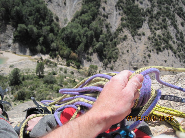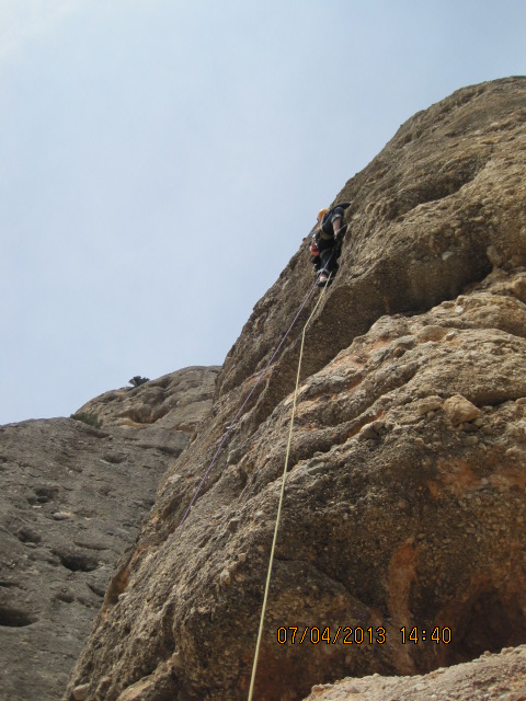 Ehhhh……..subes hasta aquí?…..No, echa los cabos de las cuerdas y empiezo desde abajo, al fin y al cabo llevo ya todo el material colgado -le contesto- .Cuando llego a su altura inicio el primer largo.