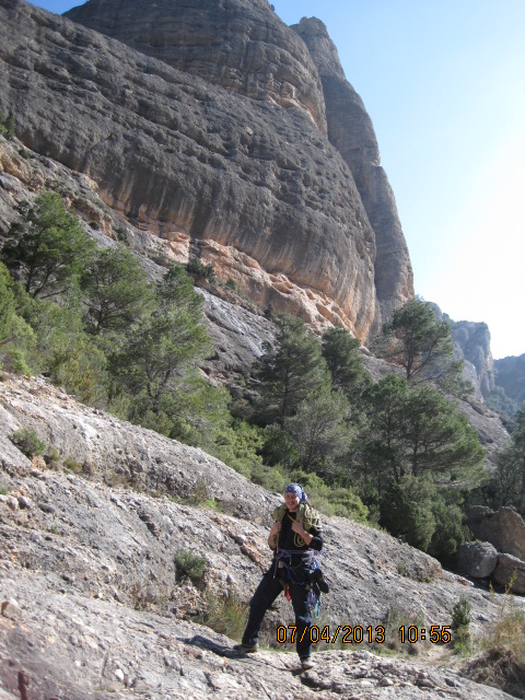 Pues sí, aún lo recuerdo desde el fallido intento anterior -le digo-. Y es que hace dos años no retiramos después de haber finalizado el primer largo. Mira -continuo- antes de llegar al casco urbano de Arnes y a la altura de la báscula, giras a la derecha por un camino estrecho asfaltado. Tras un par de kilómetros, verás que el camino se bifurca. Tomaremos el de la derecha que según los tramos puede ser de tierra o de hormigón. Pasados tres kilómetros más, llegas a un ensanchamiento de la pista donde verás una caseta derruida y una señal que indica «les Vals»……….pues ahí dejamos la furgoneta y a partir de ese punto y por un camino que sale a la izquierda nos adentramos en el valle hasta pie de pared……….¿lo recuerdas?