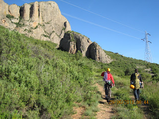 Unos refunfuñando por lo temprano, otros maravillándonos del paisaje, cargamos los trastos y comenzamos a caminar por la pista que, en fuerte subida, nos dejara en un llano desde el que parte una senda en dirección a la base del espolón. En unos 25 minutos estamos a pie de via. Son las 08.30 de la mañana y ya tenemos una cordada en el segundo largo!!!!