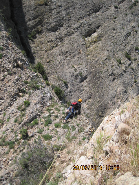 Una vez en la cumbre, deberemos de descender hacia la izquierda según miras la pared siguiendo los hitos de piedra hasta una canal a unos diez minutos de la cima (evidente) desde allí rapelaremos (unos 50 metros)y cuando llegamos al final del rapel, una sirga nos conducirá hasta el siguiente rapel (30 metros) y desde este, descendiendo un tramo por una canal herbosa, llegaremos al ultimo rapel (30 metros)que nos depositara en el suelo. En este ultimo rapel cuidado con la caída de piedras porque hay muchas rocas sueltas que podremos tirar si no bajamos con precaución
