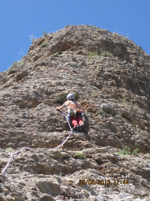 Habíamos decidido que empalmaríamos todos los que se pudieran y El buen Goyo se encargo de arrastrar la cuerda, no sin sufrirlo, durante su parte del recorrido. La roca es buena en estos primeros metros y la vía esta sobreequipada (a nuestro parecer) para el grado que tiene.