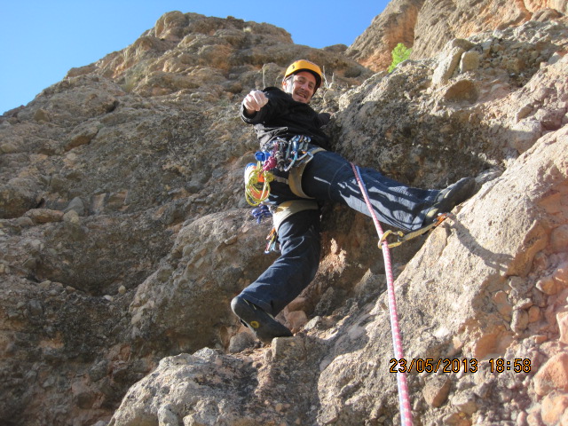 – Rapel de 40/45 metros a la derecha a buscar una sirga oxidada que se encuentra a nuestro izquierda según rapelamos. (No confundir con la cuerda fija de más abajo) Seguir la sirga hasta la instalación de rapel de rescate. Desde ahí, tres rapeles con cuerdas de 60 nos dejan en el suelo. Atención al tercer rapel (penultimo) porque encontraremos sólo una argolla de rescate. Si continuamos 10 metros más, después de la siguiente panza, hay otra instalación con dos argollas y de ahí, al suelo.