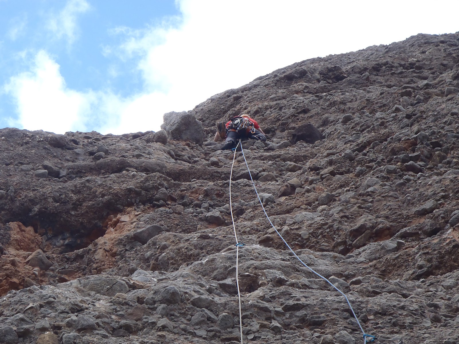 Hoy comienzo yo. El primer largo es corto, fácil (IV+) y está protegido por un par de «paraboles». Cuando llego a la primera reunión paso un cordino largo por el «tinglao» para evitar que la cuerda roce y continuo por una travesía a la izquierda hacia un diedro algo descompuesto (IV) que me lleva hasta la segunda reunión. Ruben sube, mascullando no se que sobre la calidad de la roca hasta que llega a mi altura y como va cargado de quincalla, practicamente ni se detiene, continuando sin titubear.