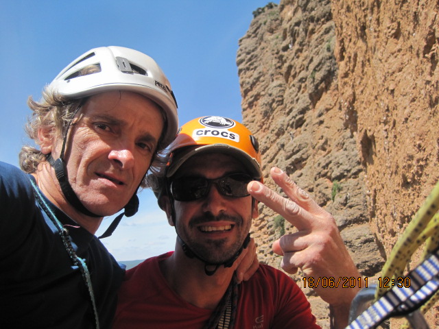Los dos siguientes largos, a excepción de la «panza» de salida de la reunión fueron un mero tramite, perdiendo el recorrido severidad hasta desembocar en la cima. Arriba los tres juntos nos dimos un gran abrazo, abajo los tres también nos regalamos un festival de cerveza.