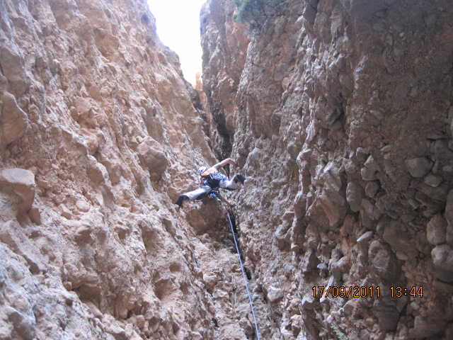 Ruben mira el primer techo de la chimenea y respira hondo. No es para tanto le digo, aunque tiene truco. No hay que encajonarse mucho y sacar el paso mirando al patio, que lo hace más bonito y espectacular. Creo que me entiende perooooo……. justo al revés, lo hace justo al revés!!!!….mira que se lo he advertido, bueno no pasa nada así aprenderá, que resople un poco y murmure cuanto quiera, más no puedo hacer….bueno si… reírme un rato. Una vez superado, se vuelve a saltar la siguiente reunión (¡que afición!), ataca el segundo techo por la izquierda y en un «plis plas» se instala confortablemente en el siguiente «tinglao» y me recupera. Y…he aquí….. que me veo penando en el primer techo, pienso que lo hago bien (voy mirando al patio, etc..) pero algo falla…..hasta que el casco me tapa los ojos y eso me recuerda que llevo a la espalda la inseparable mochila de mi compi, cargada de zapatillas, naranjas y agua y no me deja pasar por el estrechamiento….pedazo jilipollas! – me increpo -, así que en medio del «aprieto» me quito la mochila y la cuelgo del arnés…..ahora sí, esto ya funciona.