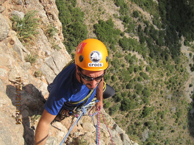 Evidentemente le dejo hacer su «pipi». Cuando finaliza. aparte de echar unas risas, cruzamos una mirada y sin más Ruben inicia el primer largo, que coincide con el primero de la «directa a la galletas» y que está marcado con la palabra «directa». Mientras sube pienso que la vía aparte de estar bien equipada permite ir «entrando en materia» poco a poco. Los siete primeros largos van de menos a más en dificultad, y en los dos últimos esta se modera. De este modo quiero convencerme que en caso de ir justito de fuerzas en el tramo final, el hecho de saber que las dos ultimas tiradas son más suaves puede suponer un alivio…., al menos para «el coco»……….cuando menos eso espero. Así un 5c, un 6a, un 6a+, un 6b, un 6c, un 6b+, un 6c, un 6a+ y un último 5c son un buen argumento para quedar satisfechos una vez hayamos finalizado la vía…..Placccc!!!!…una pequeña piedra golpea mi casco. Subes o que?…tanta prisa…. tanta prisa… y después te quedas ahí «colgao» en tus pensamientos…todos los días me haces lo mismo!!!!- exclama mi compañero-. Ya voy maestro -le grito-, joder con los jóvenes…. que ya ni los lapsus mentales de los mayores respetan……….