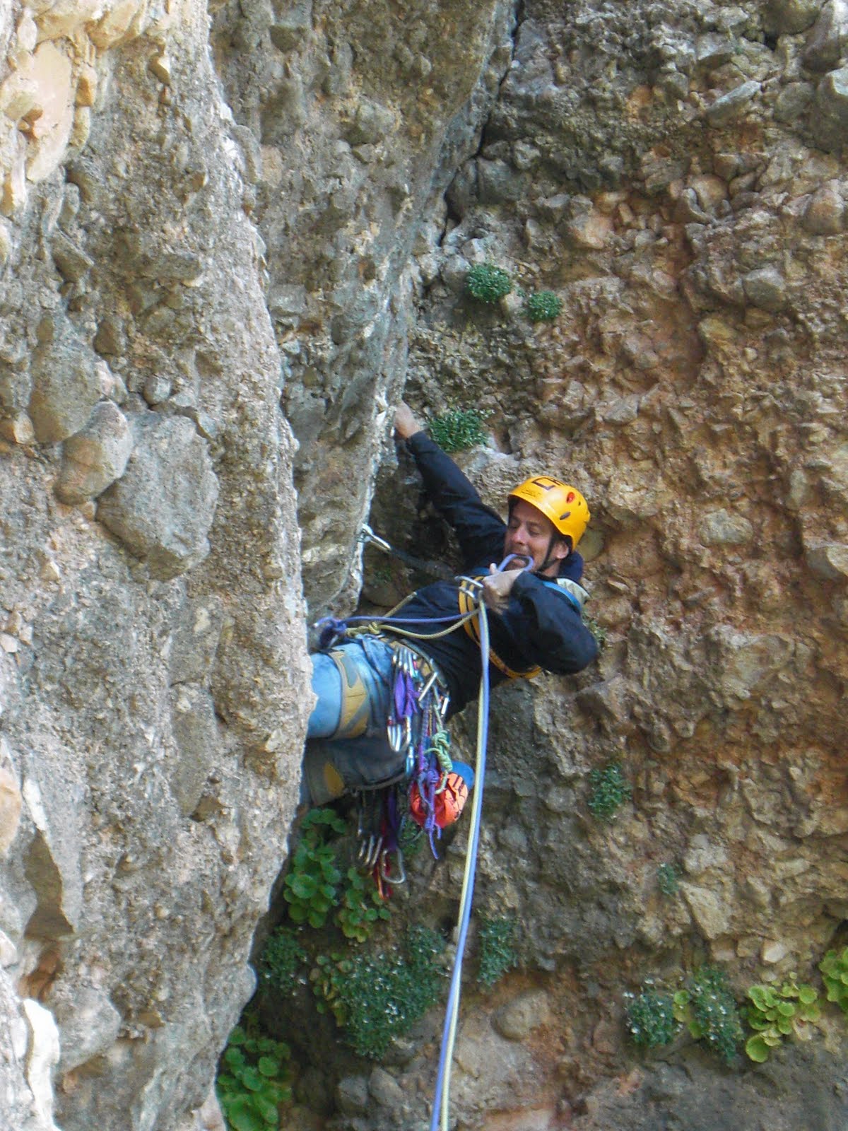 Cuando llegué a la reunión de la entosta que marca el inicio del espolón, no hubo tantas risas, había que concentrarse puesto que empezaba la función. Cambiamos las cuerdas (yo tiraría de primero) miramos la reseña, mire la “tapia”, respire profundamente y a trabajar.
